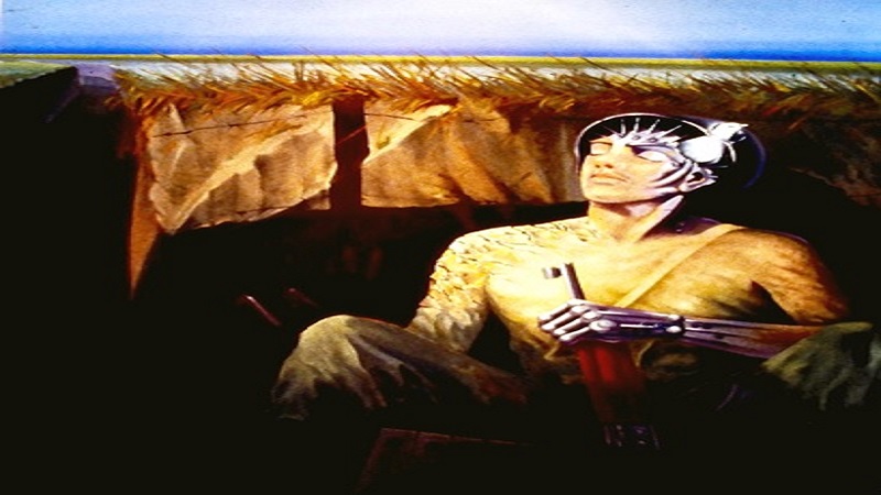 ويتضح ذلك بإحساس العزلة والقلق والغضب من منطق الحرب.. من خلال إشارته إلى الصراع على أنه مجرد فكرة، يؤكد الدكتور علاء على فكرة مناقضة وغير مبررة للحرب، فيطرح من خلال هذه اللوحة عالماً مرعبا بطريقة غير عادية: - حياتنا محاصرة بخندق حجمه متران والخلط بين والوجود والموت دون معنى واضح لأن الموت يطاردنا خارج هذه الحفرة (والمعنيان مترابطان) الأول هو الموت الغير معقول والمتناقض والعبثي. والثاني الوجود أو بمعنى أدق هذا القلب الذي بداخلنا والذي لا مكان له في مواجهة هذا المصير، نشاهده يخرج من رأس الجندي على شكل طير يريد أن يتحسس هذا الوجود بلحظاته الأخيرة وهنا تنتهي كل معرفتنا وبعدها الفناء. …