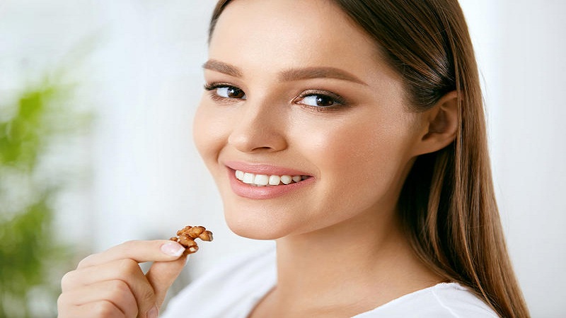 المكسرات: تحتوي على مجموعة من الفيتامينات (B،E)، التي تساعد على محاربة الجذور الحرة التي يمكن أن تسبب الإجهاد والتجاعيد، بالإضافة إلى أنها تحتوي على أحماض أوميغا 3 الدهنية، التي تساعد على تقوية غشاء البشرة، والحفاظ عليها رطبة.