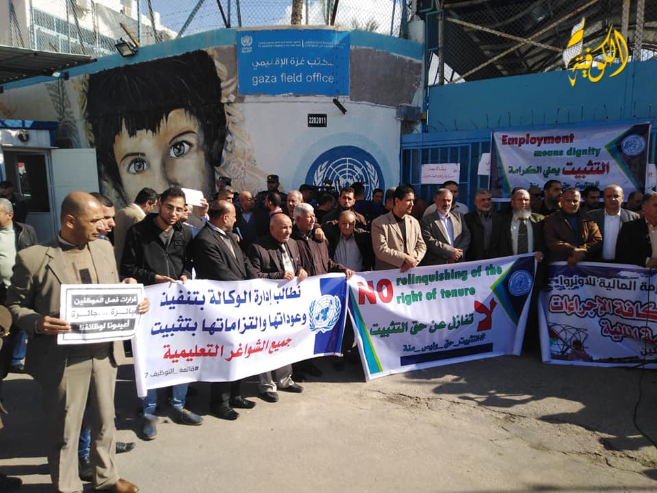 واحتشد مئات الموظفين وعوائلهم، لمطالبة إدارة الأونروا بالتراجع عن قراراتها بحق الموظفين وخصوصا أصحاب العقود.