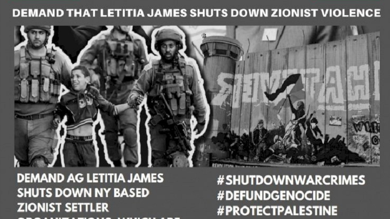 وأوضح التحالف في بيان، أن التظاهرة تهدف للضغط على المدعية العامة جونز لاتخاذ اجراءات بإغلاق ومحاكمة القائمين على أربع منظمات استيطانية تتخذ من مدينة نيويورك مركزا لها، وهي منظمات: الموازنة المركزية لإسرائيل، واصدقاء عطيرات كوهانيم، ومنظمة تمويل البؤرة الاستيطانية في الخليل، ومنظمة اصدقاء ديفيد.