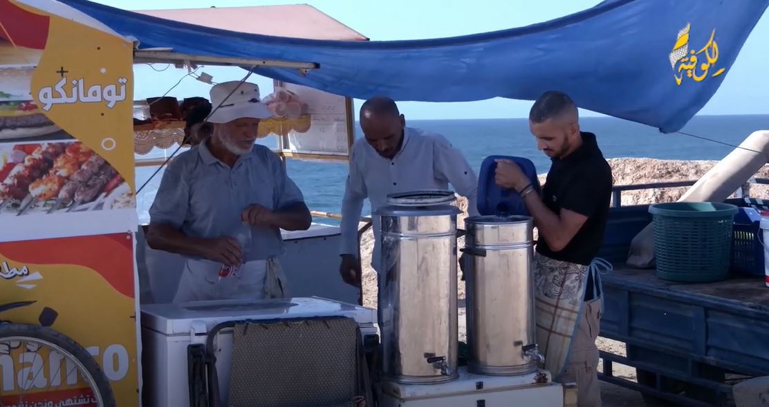 وأوضح أنه يأتي إلى العمل مع والده في فترة ما بعد الظهر، لأنه يقضى وقته في الفترة الصباحة كمتطوع في مركز لذوي الاحتياجات الخاصة، وأنه يأتي مباشرةً إلى البسطة، كي يباشر عمله بشكل خفيف في تحضير المشروبات الساخنة للزبائن، نظراً لإعاقته في يده.
