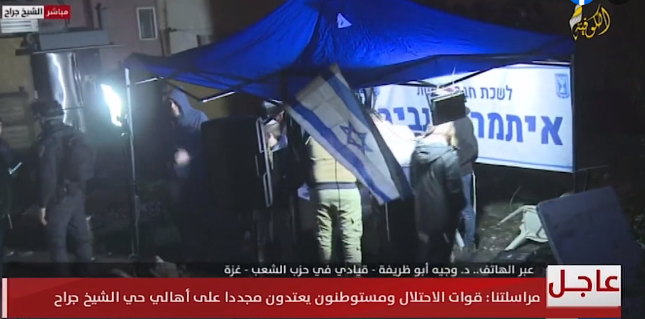 واقتحمت قوات الاحتلال حي الشيخ جراح، اليوم الأحد، لتوفير الحماية للمستوطنين الذي انتشروا في الشوارع والطرقات واحتشدوا في محيط منزل عائلة سالم، واعتدوا على المواطنين وممتلكاتهم، وأقاموا خيمة للمتطرف ايتمار بن غفير الذي أعاد فتح مكتبه اليوم هناك.