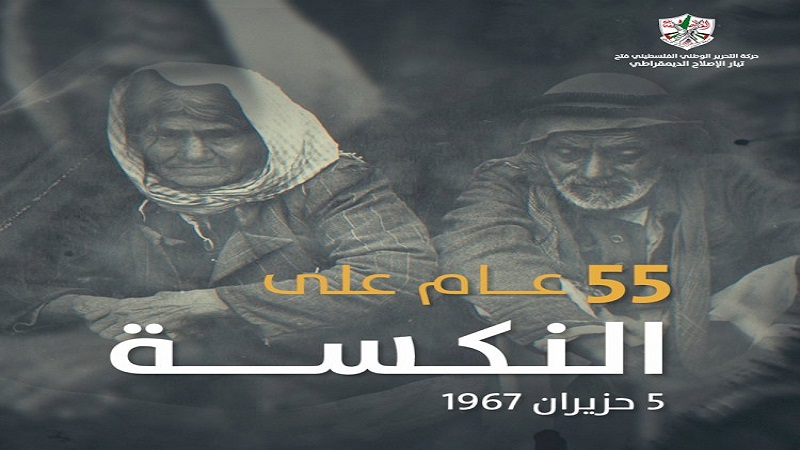 غزة: أطلقت مفوضية الإعلام في تيار الإصلاح الديمقراطي بحركة فتح، اليوم الأحد، حملة إلكترونية لإحياء الذكرى الـ 55 لنكسة حزيران عام 1967م، التي احتلت فيها دولة الاحتلال ما تبقى من فلسطين وكل من الجولان في سوريا، وشمال سيناء في مصر.