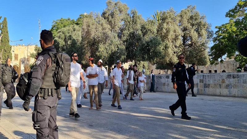 ويتعرض الأقصى يوميًّا عدا الجمعة والسبت لاقتحامات المستوطنين بحماية قوات الاحتلال، على فترتين صباحية ومسائية، في محاولة لتغيير الأمر الواقع بالأقصى ومحاولة تقسيمه زمانيًّا، فيما تشهد القدس القديمة وبواباتها إجراءات عسكرية مشددة تتمثل بالتفتيش الدقيق للمواطنين والمصلين في الأقصى والاعتداء عليهم.