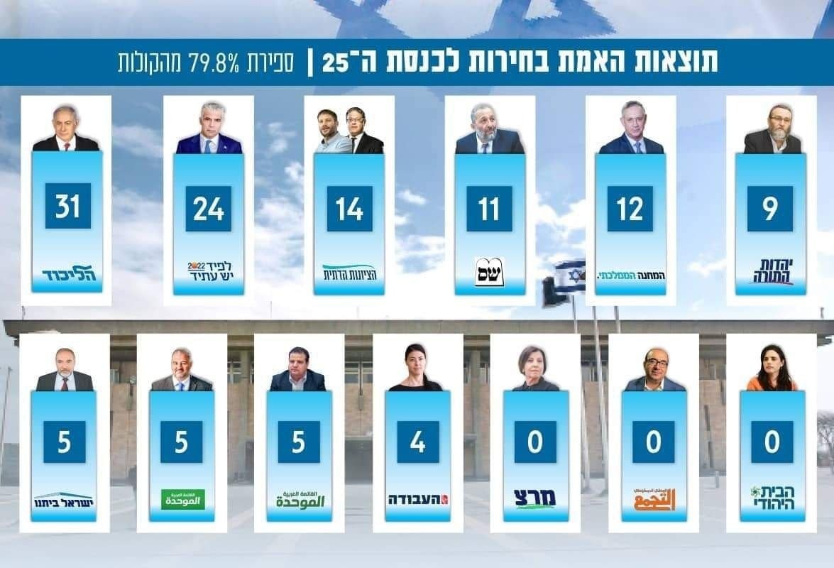 ووفقًا للنتائج حتى الآن، فاز الليكود بـ 32 مقعدا، واليمين بـ 67 مقعدًا فيما الائتلاف الآخر 49 مقعدا.