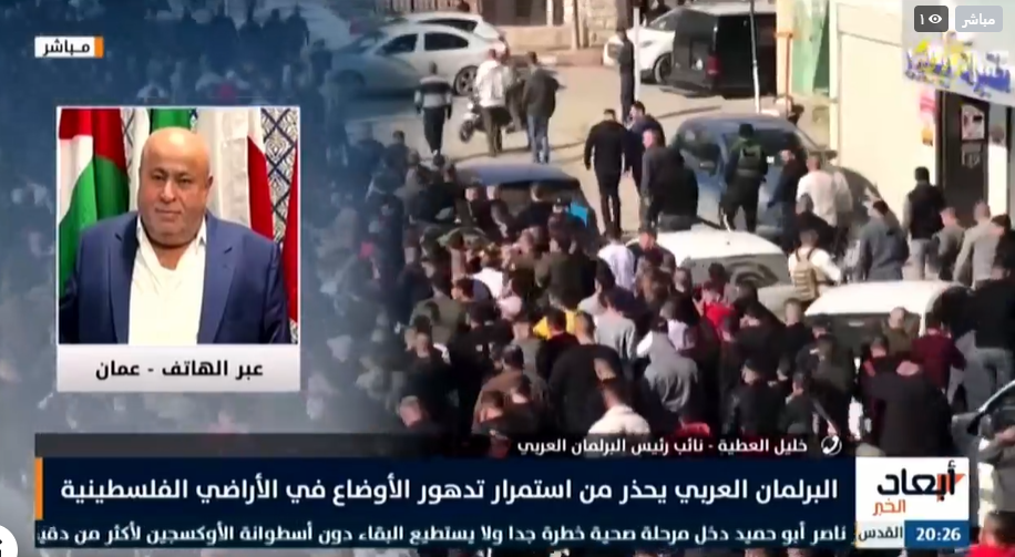 عمان: قال، نائب رئيس البرلمان العربي، خليل العطية، إن " البرلمان العربي أدان التصعيد الإسرائيلي في الضفة، وحذر من أن هذا التصعيد سيؤدي إلى مزيد من موجات العنف، وتفجير الأوضاع"، لافتًا إلى أن الاحتلال الإسرائيلي ينتهك كافة القوانين.