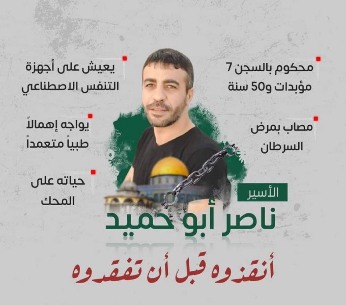والأسير "أبو حميد"، من مخيم الأمعري قرب رام الله معتقل منذ عام 2002 ومحكوم عليه بالسجن المؤبد 7 مرات و50 عاما إضافية، ويعاني إهمالا طبيا متعمدا تسبب في إصابته بالسرطان والعديد من الأمراض.