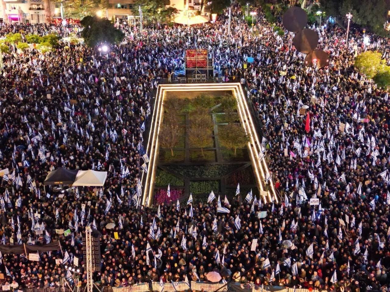 تل أبيب: شارك نحو 100 ألفٍ في مظاهرة احتجاجية رفضًا لحكومة الاحتلال الإسرائيلي والتي يترأسها بنيامين نتنياهو، في تل أبيب والقدس وحيفا وسط انتشار مكثف لعناصر الشرطة الإسرائيلية، بينهم 80 ألفا في تل أبيب وحدها.