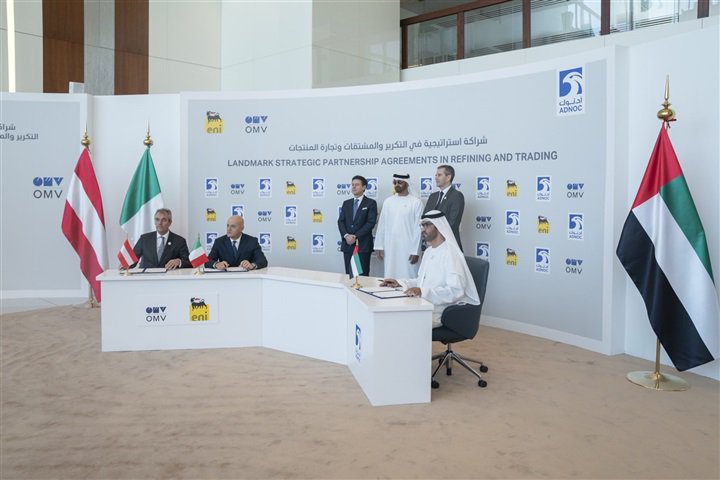 ونشر بن زايد، صورًا من بروتوكول التوقيع عبر حسابه الشخصى على موقع "تويتر"، وكتب "نبارك توقيع شراكة استراتيجية بين "أدنوك" و"إيني" الإيطالية و"أو أم في" النمساوية في مجال التكرير والمشتقات وتجارة المنتجات.