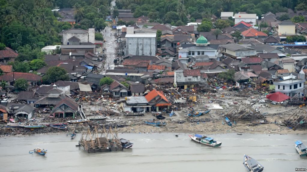 وتسبب انهيار كتلة من الجزيرة البركانية مع ارتفاع المد يوم السبت في أمواج وصل ارتفاعها إلى خمسة أمتار اجتاحت الساحل المطل على مضيق سوندا بين جزيرتي جاوة وسومطرة.