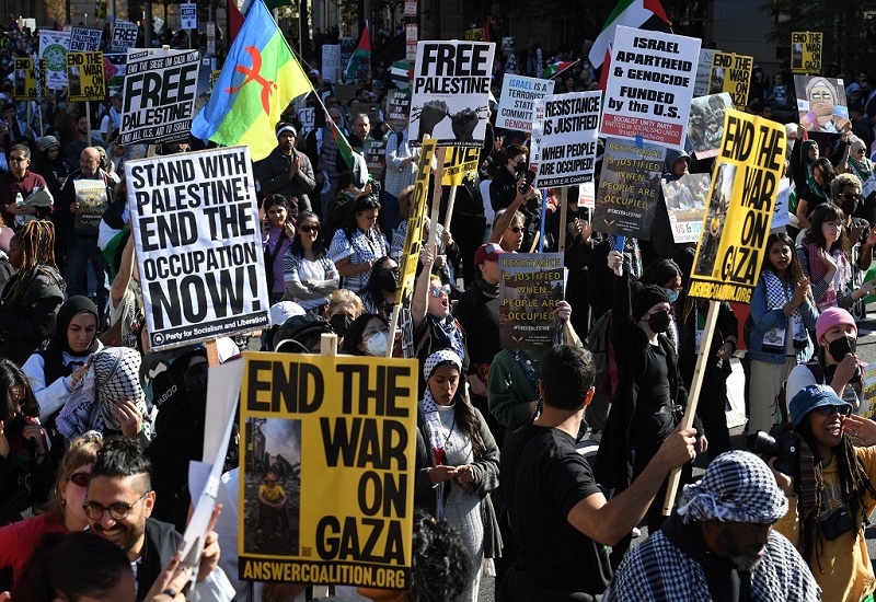 واشنطن: تظاهر الآلاف من الأمريكيين، اليوم السبت، في العاصمة واشنطن، تنديدا بالعدوان الإسرائيلي على قطاع غزة.