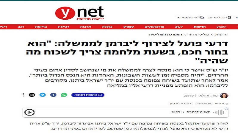 ترجمة خاصة للكوفية: يسعى رئيس حزب "شاس" أريه أدرعي، لضم رئيس حزب "إسرائيل بيتنا" أفيغدور ليبرمان إلى الائتلاف الحكومي رغم معارضة "الحريديم" لتوليه أي منصب وزاري.