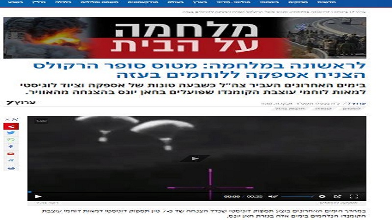 ترجمة خاصة للكوفية: ذكرت القناة السابعة العبرية، أنه للمرة الأولى منذ بدء الحرب في قطاع غزة يتم تنفيذ عملية إمداد "لوجستي" تضمنت إسقاط نحو 7 أطنان من الإمدادات اللوجستية لجنود الاحتلال في خان يونس.