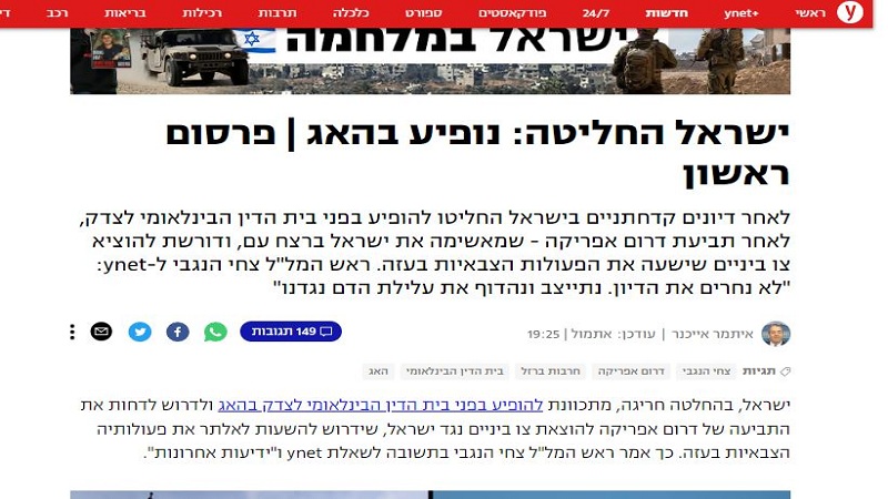 ترجمة للكوفية: ذكرت صحيفة "يديعوت أحرونوت" العبرية، أنه عقب مناقشات ساخنة وحادة في الأوساط السياسية قررت إسرائيل على لسان رئيس المجلس القومي تساحي هناجبي، المثول أمام محكمة العدل الدولية بتهمة ارتكاب جرائم حرب بحق الفلسطينين في قطاع غزة.