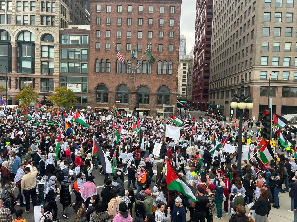 وردد المحتجون شعارات تطالب بضرورة الضغط على الإدارة الأمريكية والدول الغربية للتراجع عن دعمهم لإسرائيل، وهتافات داعمة للحقوق الفلسطينية وصمود الشعب الفلسطيني.