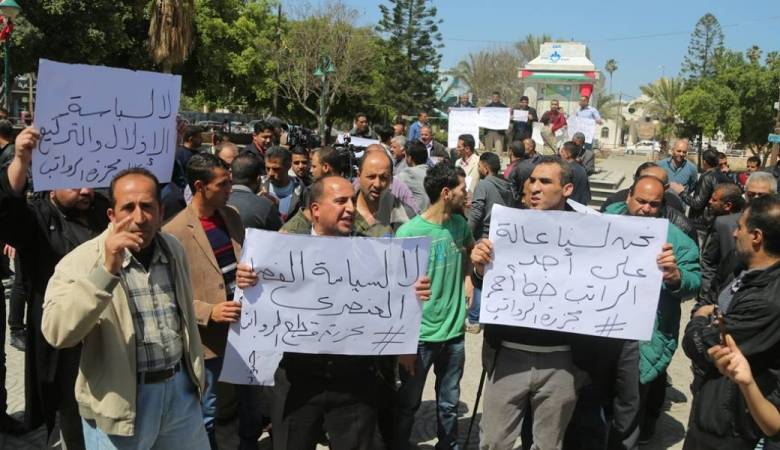 تظاهر العشرات من موظفي السلطة الفلسطينية في قطاع غزة، الأحد، أمام مقر مجلس الوزراء بمدينة غزة للمطالبة بصرف رواتبهم بعد تأخرها نحو ثلاثة أسابيع.
