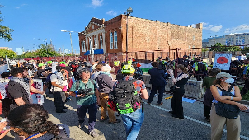 شيكاغو: تظاهر عشرات النشطاء وأعضاء من المنظمات الحقوقية، أمام المؤتمر الوطني للحزب الديمقراطي المنعقد في مدينة شيكاغو بولاية إلينوي، للمطالبة بوقف ارسال شحنات الأسلحة الى اسرائيل.
