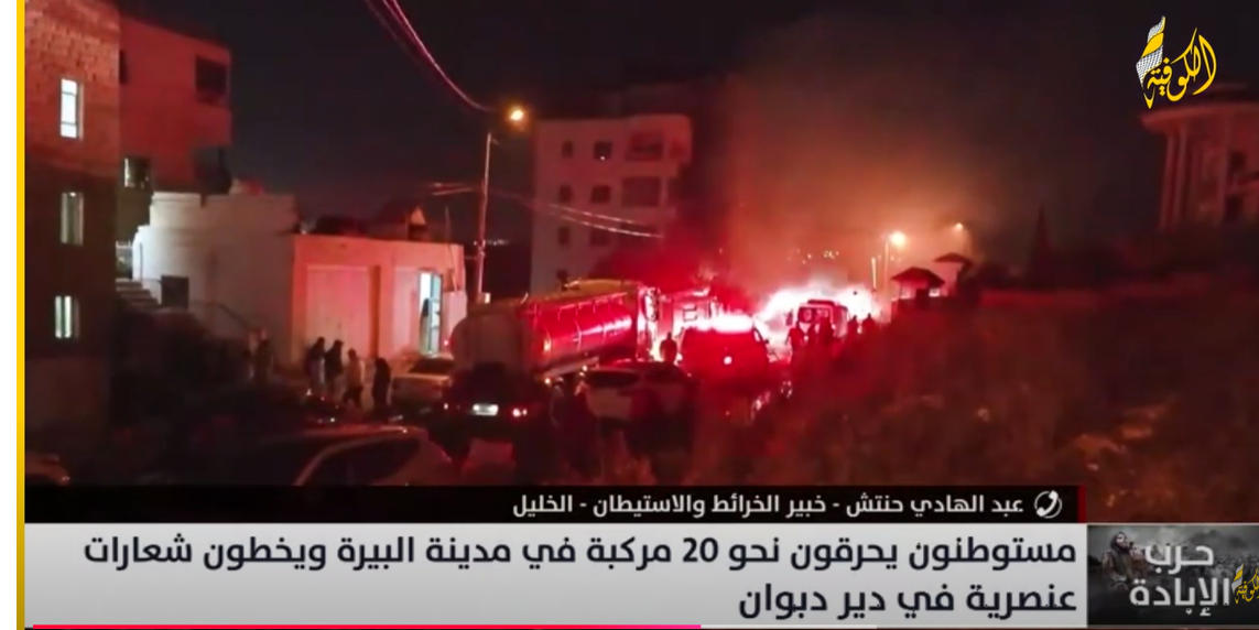 مستوطنون يحرقون نحو 20 مركبة في مدينة البيرة ويخطون شعارات عنصرية في دير دبوان