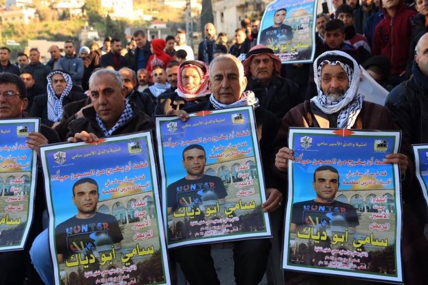 ورفع المشاركون في الوقفة التضامنية، الأعلام الفلسطينية، وصور الأسير أبو دياك، والشعارات المنددة بسياسة الاحتلال الإسرائيلي تجاه الأسرى بشكل عام، خاصة أبو دياك الذي يتهدده خطر الموت ومعاناته من مرض السرطان، والذى يتواجد بشكل دائم بعيادة الرملة.