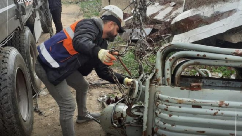 بالصور || طواقم كهرباء غزة تواصل إزالة مكونات شبكات الكهرباء المتضررة من الشوارع في رفح