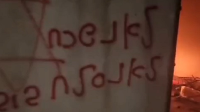 بالفيديو || مستوطنون يحرقون غرفة زراعية ويخطون شعارات عنصرية بالخليل