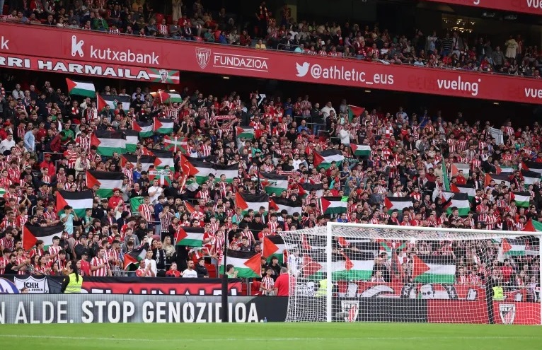 ورفعت الجماهير الكبيرة خلال العرض العلم الفلسطيني ورفعت لافتة رسالة تضامنية على شاشات الملعب: "أتلتيك مع فلسطين. أوقفوا الإبادة".