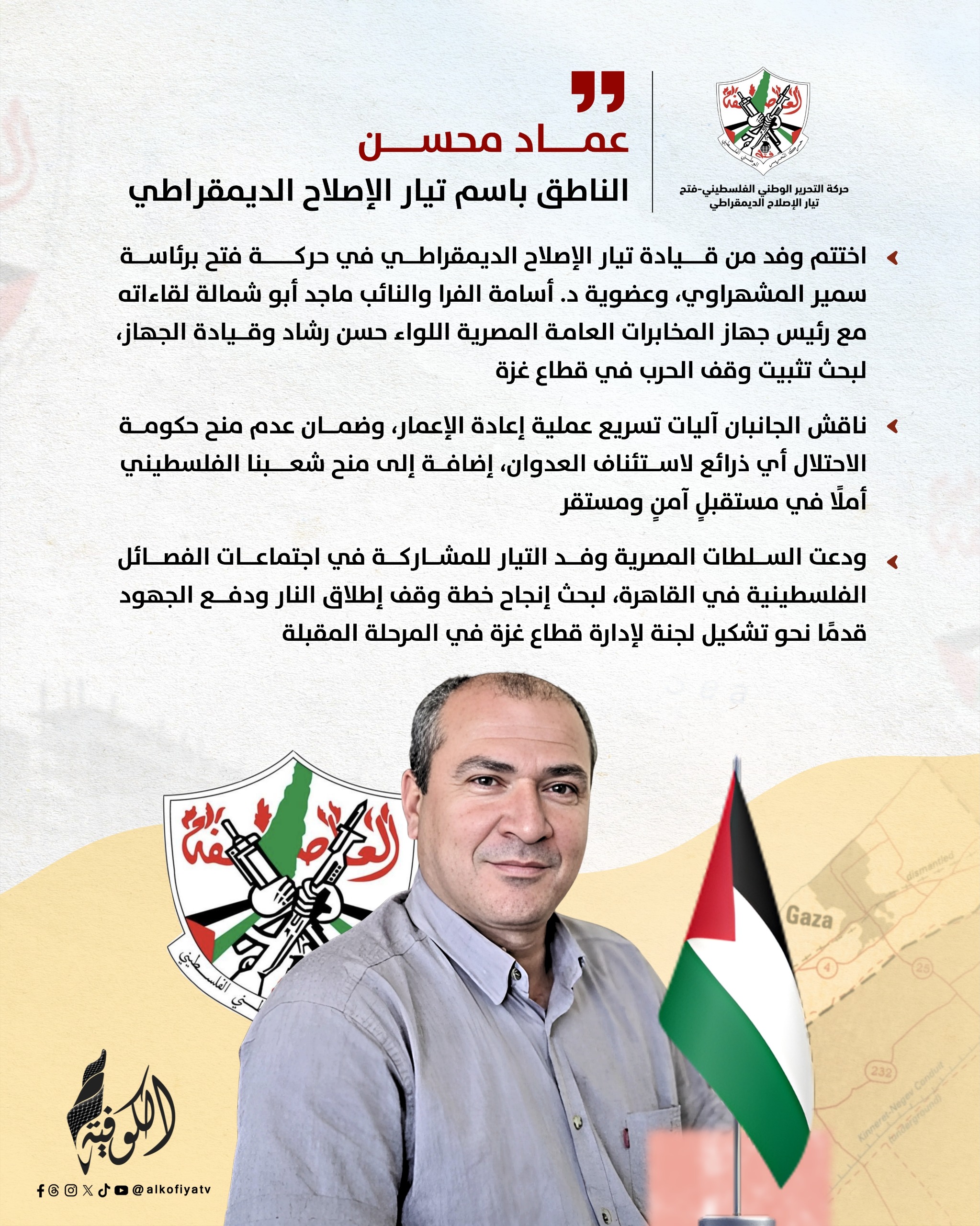 الكوفية قال عماد محسن الناطق باسم تيار الإصلاح الديمقراطي في حركة فتح، إن وفد التيار برئاسة سمير المشهراوي، وعضوية الدكتور أسامة الفرا والنائب ماجد أبو شمالة، اختتم لقاءاته مع مسؤولي المخابرات المصرية برئاسة اللواء حسن رشاد، حيث تناولت خطة وقف الحرب في قطاع غزة وسبل إنجاحها بما يضمن عدم العودة إلى التصعيد.