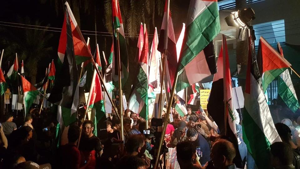 "محدث" بالفيديو والصور: متظاهرون يقتحمون سفارة البحرين في بغداد ويرفعون علم فلسطين