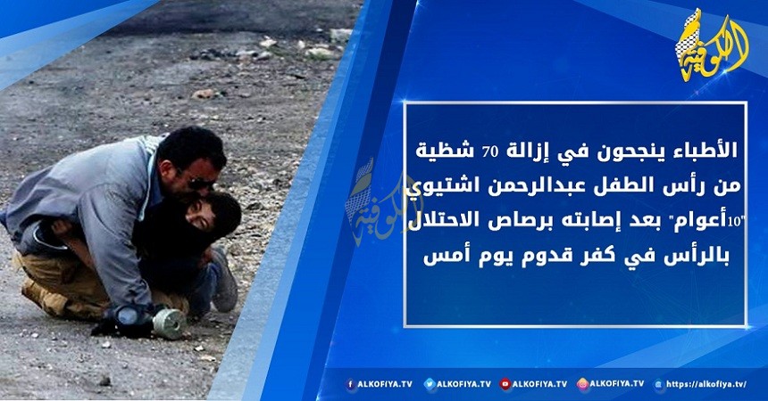 رام الله: ا نجح الأطباء، في مستشفى رفيديا بمدينة نابلس، شمال الضفة الفلسطينية، من إزالة 70 شظية، من رأس الطفل عبدالرحمن اشتيوي، "10 أعوام" بعد إصابته برصاص جيش الاحتلال الإسرائيلي، بالرأس في كفر قدوم، يوم أمس الجمعة.