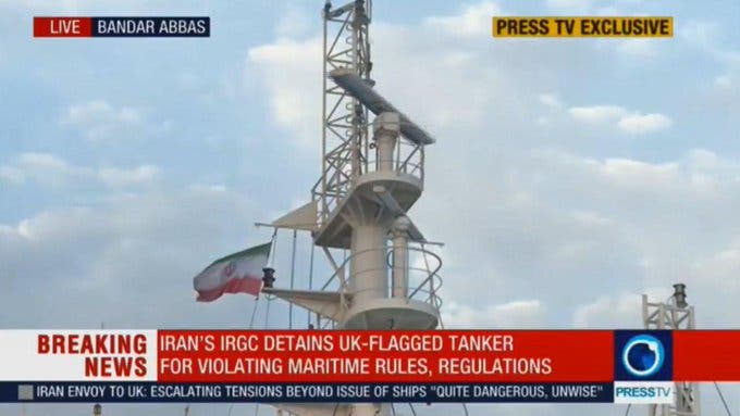 وكالات: نشرت قناة (برس تي في) الإيرانية، فيديو يظهر رفع العلم الإيراني على الناقلة البريطانية (ستينا إمبيرو) المحتجزة من قبل الحرس الثوري الإيراني منذ الجمعة، بدعوى مخالفتها قوانين الملاحة.