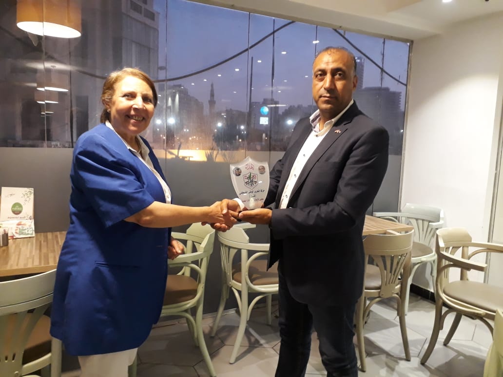 وفي نهاية اللقاء قدم أستاذ العلوم السياسية بجامعتي القدس والأقصى والقيادي بحركة فتح، الدكتور أيمن الرقب، وأعضاء اللجنة، درع العاصفة إلى الكاتبة حياة الشيمي، تقديرًا لجهودها المستمرة لخدمة فلسطين والقضية الفلسطينية.