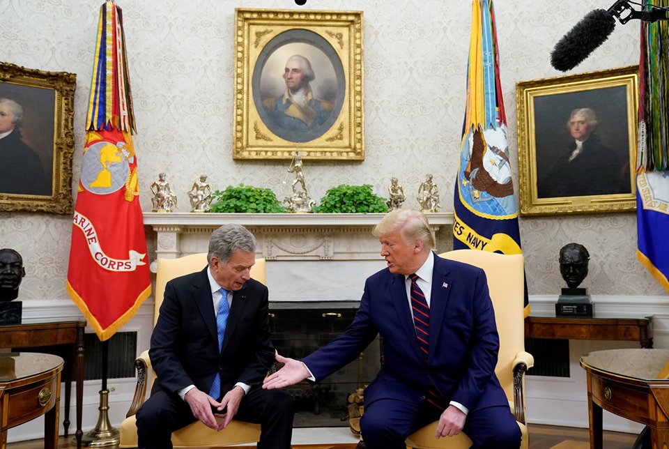 وحاول ترامب "كسر الجليد" خلال لقاء جمعه بضيفه رئيس فنلندا، ساولي نينيستو، عبر التربيت على ركبته، كإشارة منه لاختصار المسافات بين الزعمين، إلا أن ردة فعل نينيستو كانت حاسمة وصريحة، فعمد إلى إبعاد يد ترامب عن رجله بحركة سريعة.