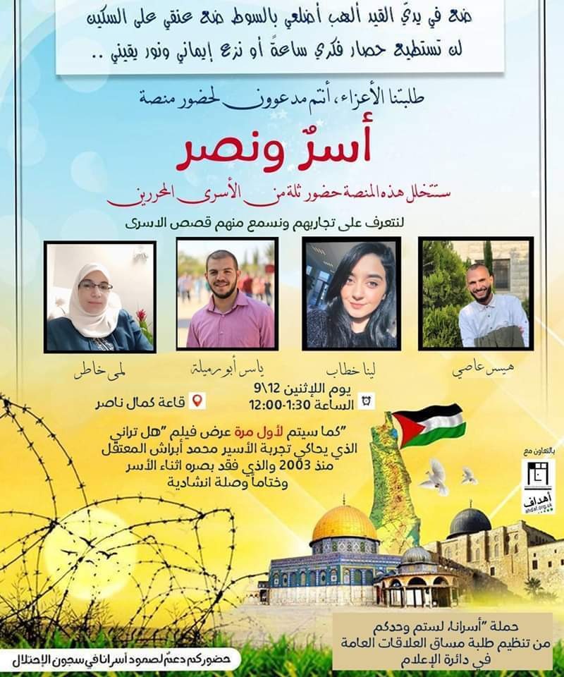 رام الله: أقام مجموعة من طلبة الإعلام في جامعة بيرزيت، حملة "أسرانا، لستم وحدكم"، وهي حملة نظمها الطلبة ضمن مساق العلاقات العامة، الذي يدرسه الطلبة في تخصص الاعلام، تهدف لزيادة الوعي بقضايا وظروف حياة الأسرى، داخل سجون الاحتلال.