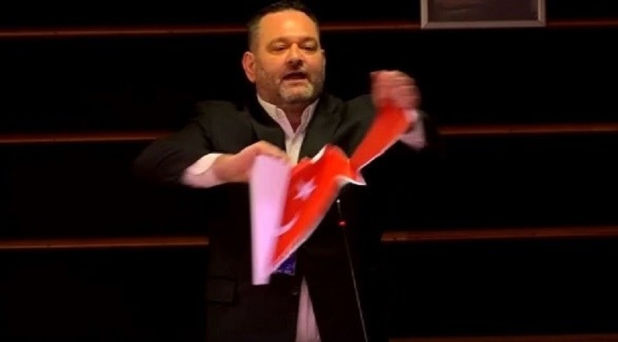 نائب يمزق علم تركيا خلال جلسة للبرلمان الأوروبي: ملطخ بالدماء