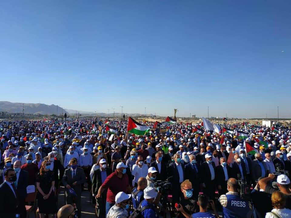 واحتشد الآلاف في أريحا في جنوب غور الأردن، قرب البحر الميت، في أكبر تظاهرة تشهدها الضفة الغربية منذ إعلان الخطة الأمريكية للسلام في الشرق الأوسط أواخر يناير/كانون الثاني، مرددين شعارات "لا دولة فلسطينية بدون غور الأردن" و"فلسطين ليست للبيع".