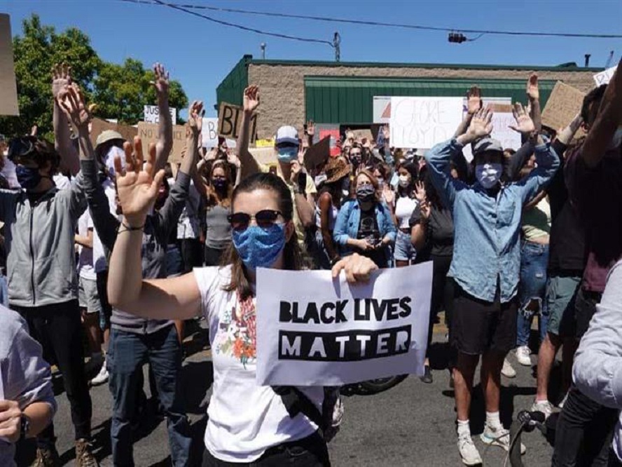 ورفع المتظاهرون ملصقات ولافتات كتب عليها شعارات بالإنجليزية مثل "العنصرية تقتل نفسيا وبدنيا وعالميا"، و"تخلصوا من العنصرية".