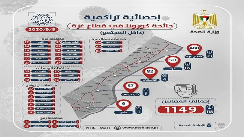 وأفادت الصحة في الإحصائية التراكمية حول جائحة كورونا، أن "إجمالي الإصابات 1149، منها 480 شمال القطاع، 513 في غزة، 82 في الوسطى، 57 في خانيونس، 9 في رفح".