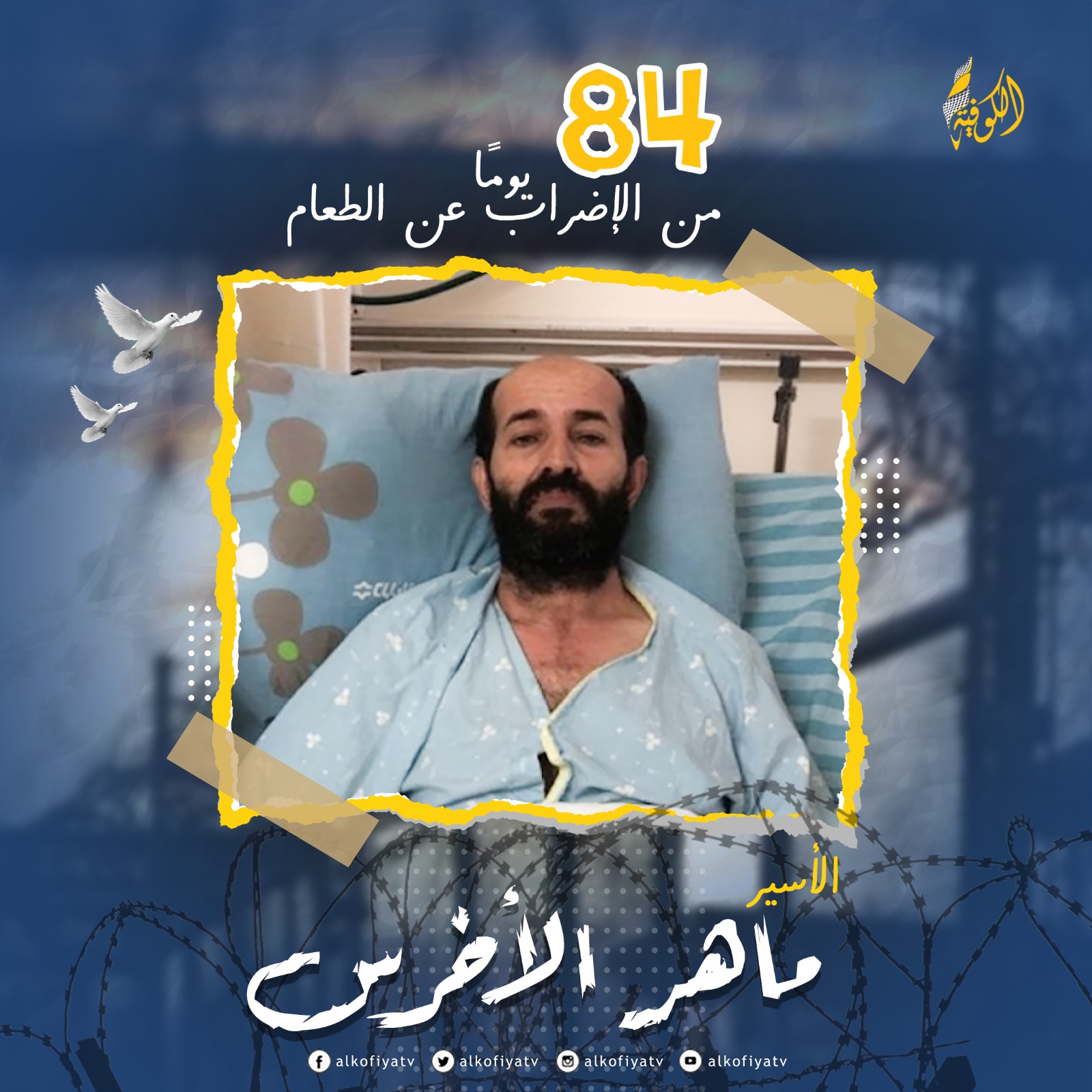 رام الله: يدخل الأسير ماهر الأخرس صباح الأحد، يومه الـ 84 في إضرابه المفتوح عن الطعام، رفضًا لاعتقاله الإداري، ووضعه الصحي يزداد خطورة يومًا بعد يوم.