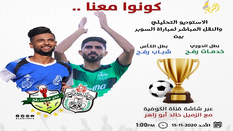 غزة: تقدم قناة "الكوفية" بثًا مباشرًا لمبارة كأس السوير بين فريقي خدمات رفح وشباب رفح على الهواء مباشرة، في تمام الساعة الثانية ظهراً.