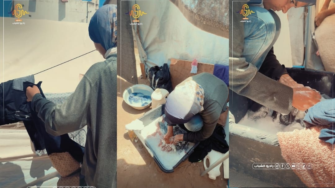 بالفيديو// فتاة نازحة تقوم بالعمل في غسيل الملابس في محاولة منها لإعالة أسرتها
