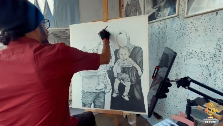 بالفيديو// شاب من ذوي الاحتياجات الخاصة ينشئ معرضه الخاص للرسم داخل خيمة بدير البلح