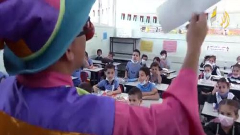 غزة – عمرو طبش: بطريقة غير تقليدية، تمكن المعلم الفلسطيني لؤي الشيخ عيد، من سكان مدينة رفح، من دمج الفن مع التعليم، من خلال توظيفه شخصية المهرج في تدريس مادة اللغة الإنجليزية داخل الفصل الدراسي، وذلك لخدمة التعليم والارتقاء بمستوى تحصيل الطالب، خاصةً أن طلبة الصف الأول الابتدائي لم يتمكنوا من دخول رياض الأطفال التي تؤهلهم للمدارس، بسبب جائحة كورونا.