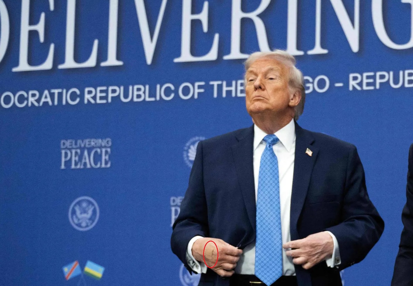 وعندما وقف الرئيس الأميركي بجانب المنصة بينما كان المسؤولون الآخرون يُلقون خطاباتهم، كانت الضمادة ظاهرة على يده اليمنى بوضوح، على الرغم من تغطيتها بيده الأخرى أحياناً خلال الحدث.