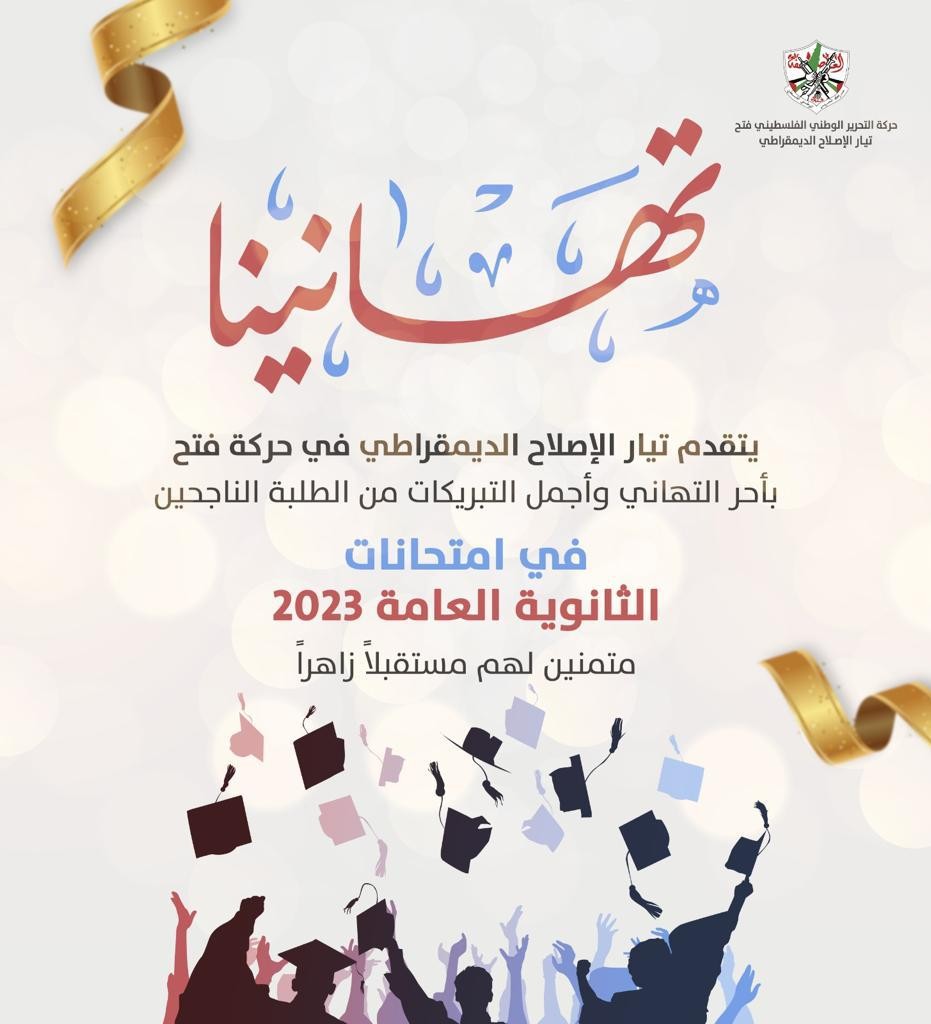 تقدم تيار الإصلاح الديمقراطي في حركة فتح، بأجمل التهاني والتبريكات من عموم طلبة الثانوية العامة الناجحين لهذا العام في كافة محافظات الوطن، وخاصة أبناء الشهداء والأسرى.