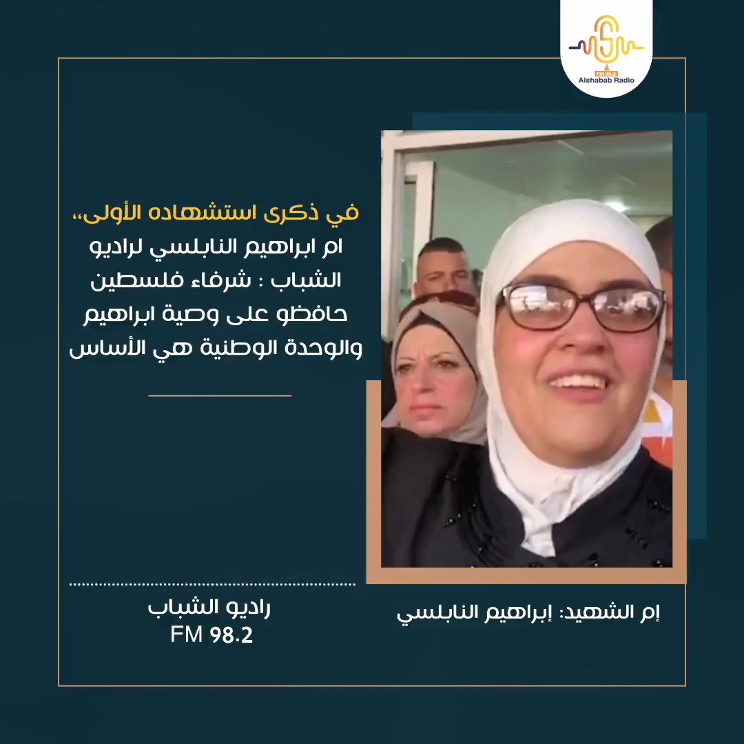 والدة ابراهيم النابلسي لراديو الشباب: شرفاء فلسطين حافظو على وصية إبراهيم والوحدة الوطنية هي الأساس